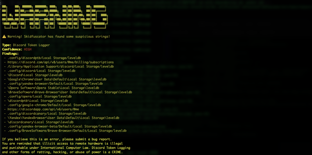 As of now, several token logging strings, found from various sources, have been blacklisted. We do not tolerate nor condone the spread of malware, and will continuously pursue against fighting it. As of now, the following warning will be displayed: