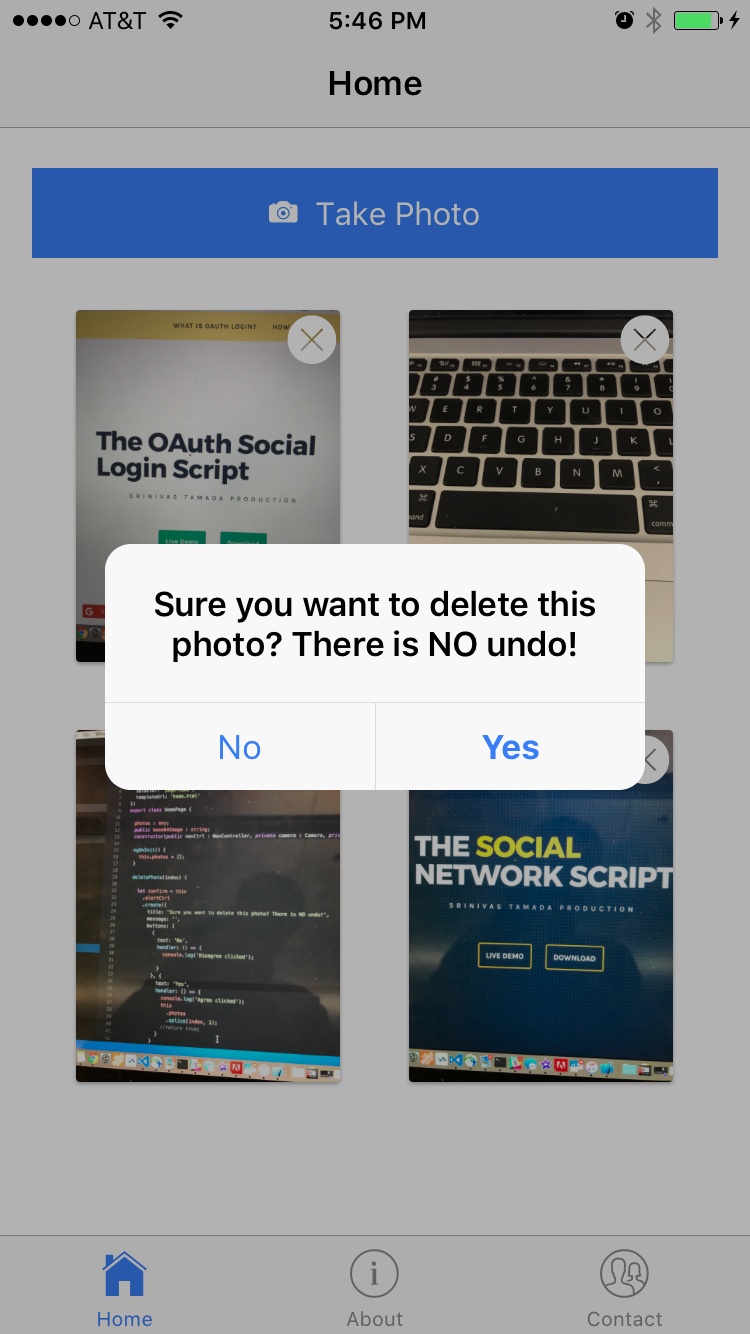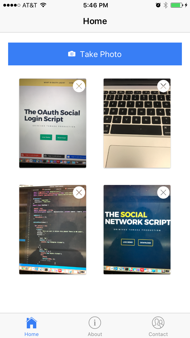 Using the camera with Ionic 2 native, taking multiple pictures with Delete Option. This package is powered by www.9lessons.info blog feed content and developed using Ionic v2 and Angular 2.